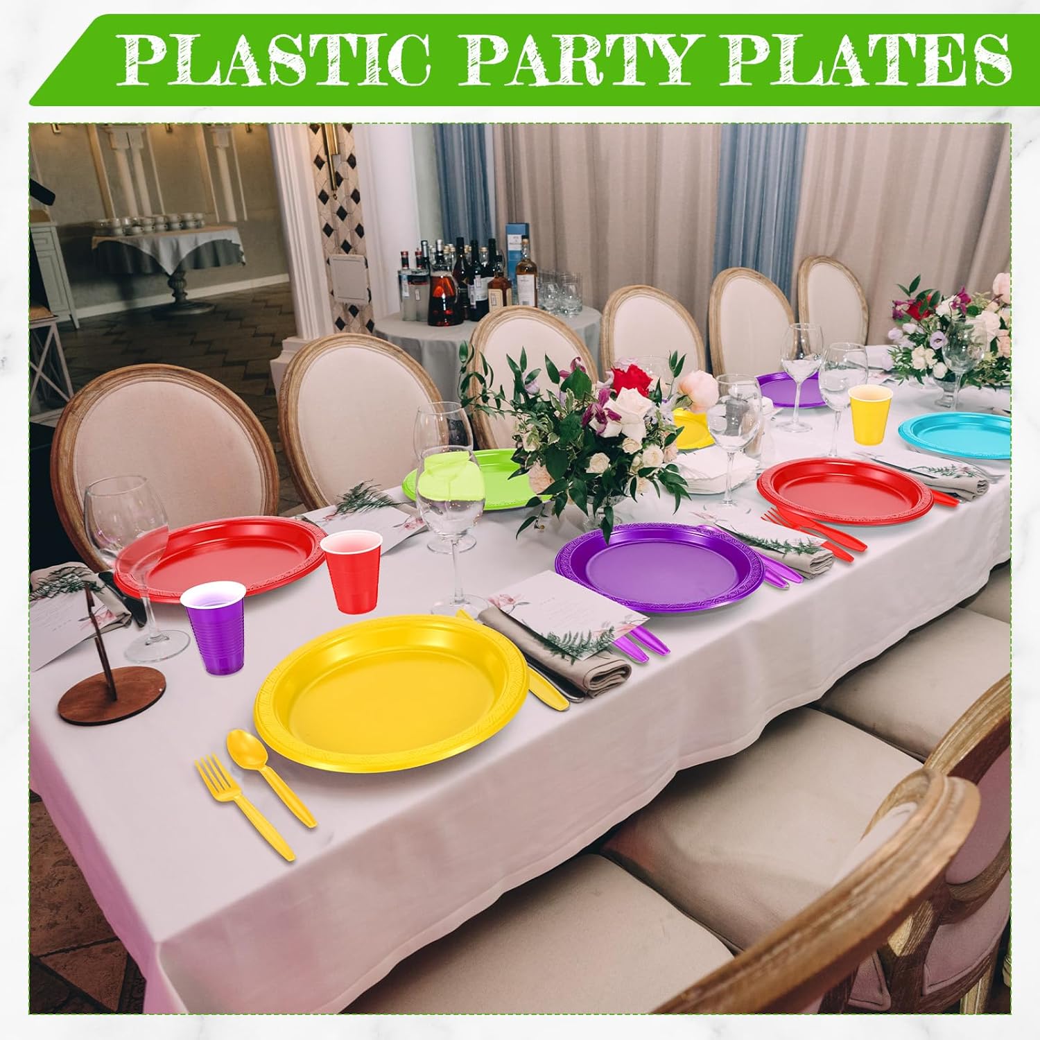 Features: If you need to bring a gift for a friend's or family member's party, these wedding dinnerware sets are a good gift option. They are practical and useful, making them an ideal present for any celebration. The color design is also attractive and stylish, which will certainly add a modern atmosphere to the party. The sturdy construction of the plates, cups, and others makes them safe for guests to use. You will not have to worry about plates or cups breaking. The items in the set are also portable and lightweight, which makes them easy to carry and distribute to guests. This set provides a comfortable eating experience for guests while maintaining safety and convenience. Specifications: Material: plastic Size (about): Plastic plates: 9 inches, 7 inches Plastic cups: 16 oz Package includes: 50 x Plastic dinner plates (9 inches) 50 x Plastic appetizer plates (7 inches) 50 x Plastic cups 50 x Knives 50 x Spoons 50 x Forks Notes: Manual measurement, please allow slight errors on size. The color may exist a slight difference due to different screen displays. Pointed items are included, it is recommended to wear tool gloves to avoid injury when using and please keep it away from kids