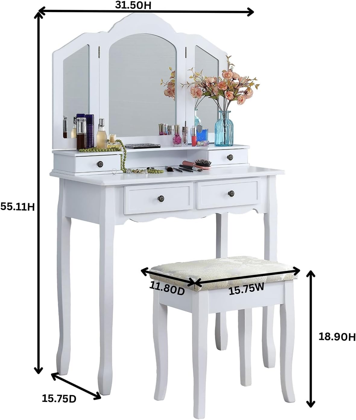 Product Features Durable wood construction with a rose gold finish. Set includes vanity, mirror, and bench 3-panel beveled mirror and four vanity box drawers. Brushed nickel hardware Hand-applied rose gold finish. Ample storage space for makeups and jewries. The rectangular bench is thickly upholstered Table: 31.5"W x 15.75"D x 55.11"H, Stool: 18"W x 14.5"D x 18.90"H Some assembly needed. Photo may be slightly different from the actual item in terms of color due to the monitor's display This Wooden Vanity Make Up Table and Stool Set, Rose Gold A simple design and handy storage features ake the Wood Vanity Set perfect for any bedroom. It's gonna be an essential piece in your bedroom, as well as a perfect gift! The tri-fold mirror is moveable for a three-sided view that's perfect for makeup and hair. It also includes a matching wooden stool with padded upholstered seat.
